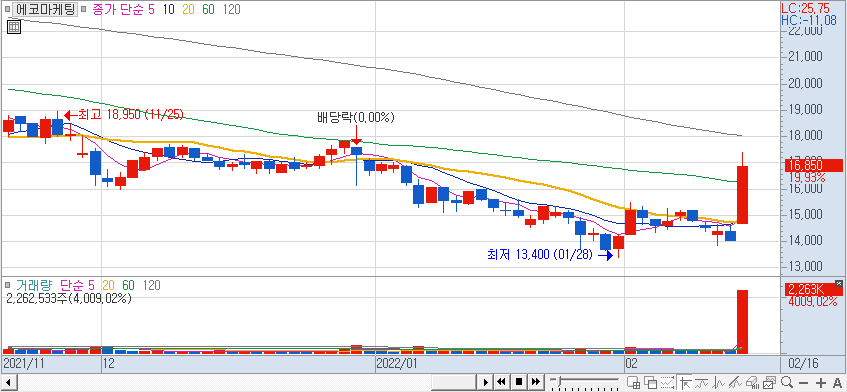 에코마케팅 - 전기대비 영업이익 100%, 당기순이익 200% 증가, 자사주 소각등 주주가치 제고 활동 고점대비 50% 이상 하락한 시점에서 나온 장대양봉, 추세전환이 될 수 있음