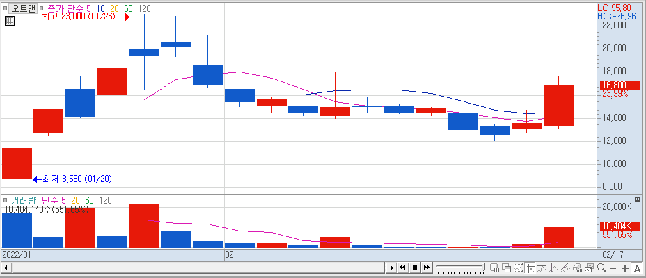 오토앤 - 거래량이 실린 장대양봉 출현, 18350원 자리만 뚫어주면 더 올라갈 수 있을 것 같음