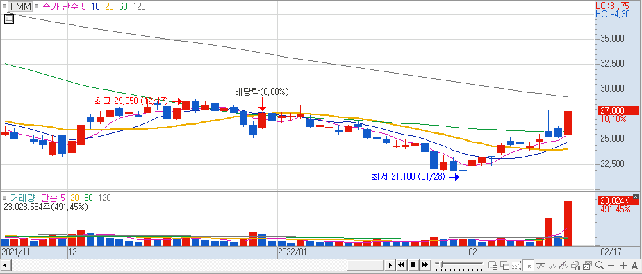 HMM - 매출액은 2020년보다 115% 증가했으며, 같은 기간 영업이익은 무려 652% 급증, 턴어라운드 되어서 추세 반전 될 수 있을 것 처럼 보임.
