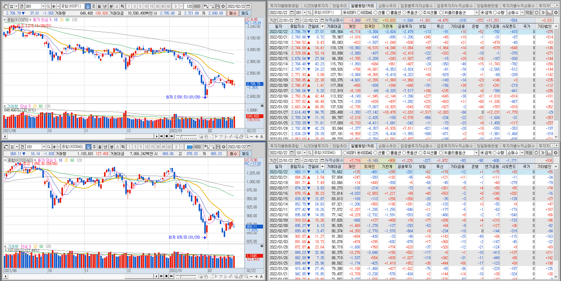 코스피 코스닥 모두 며칠간 반등해주는 모습 보이다가 러시아가 우크라이나에 병력을 보낸다는 뉴스에 갭하락 시작 후 장 내내 횡보하다가 하락마감, 코스피에서는 외인 기관 양매도 포지션. 러시아-우크라이나 이슈가 해결되기 전까지 시장이 안정되긴 힘들 것 처럼 보임.