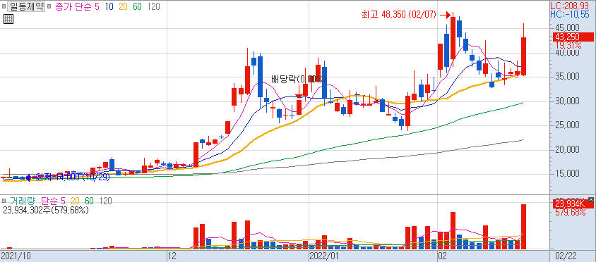 일봉 기준 최대 거래대금을 기록하면서 전고점인48350도 돌파할 가능성이 생김. 코로나 일일 확진자도 15만명이 넘어서 내일도 반응이 바로 나올 수 있을 것 같음.