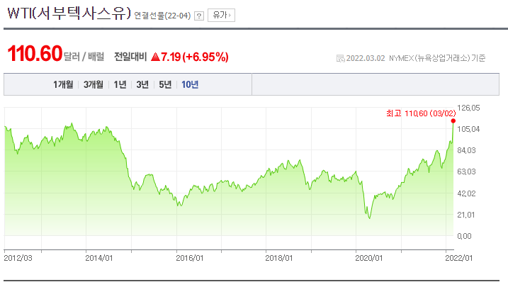 서부텍사스유가 10년만에 최고가를 달성하면서 석유 관련주(한국석유,흥구석유)들이 줄줄이 상승함.