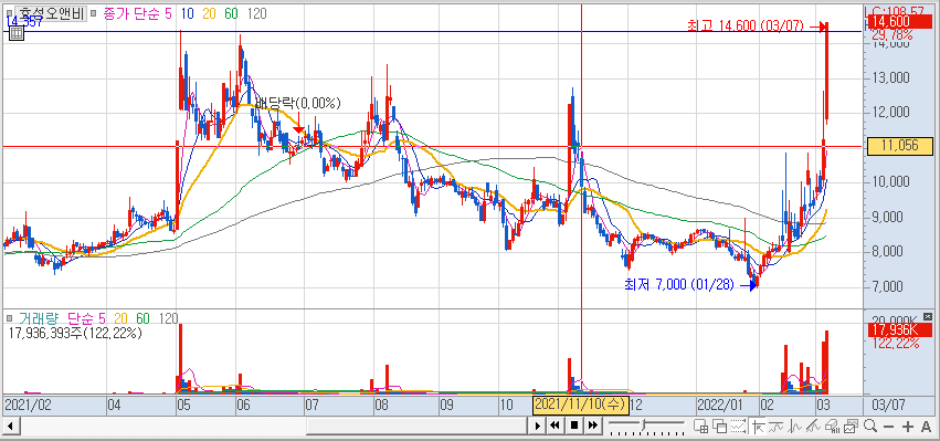 곡물 가격이 최고치를 경신하면서 곡물관련주인 효성오앤비 상한가
