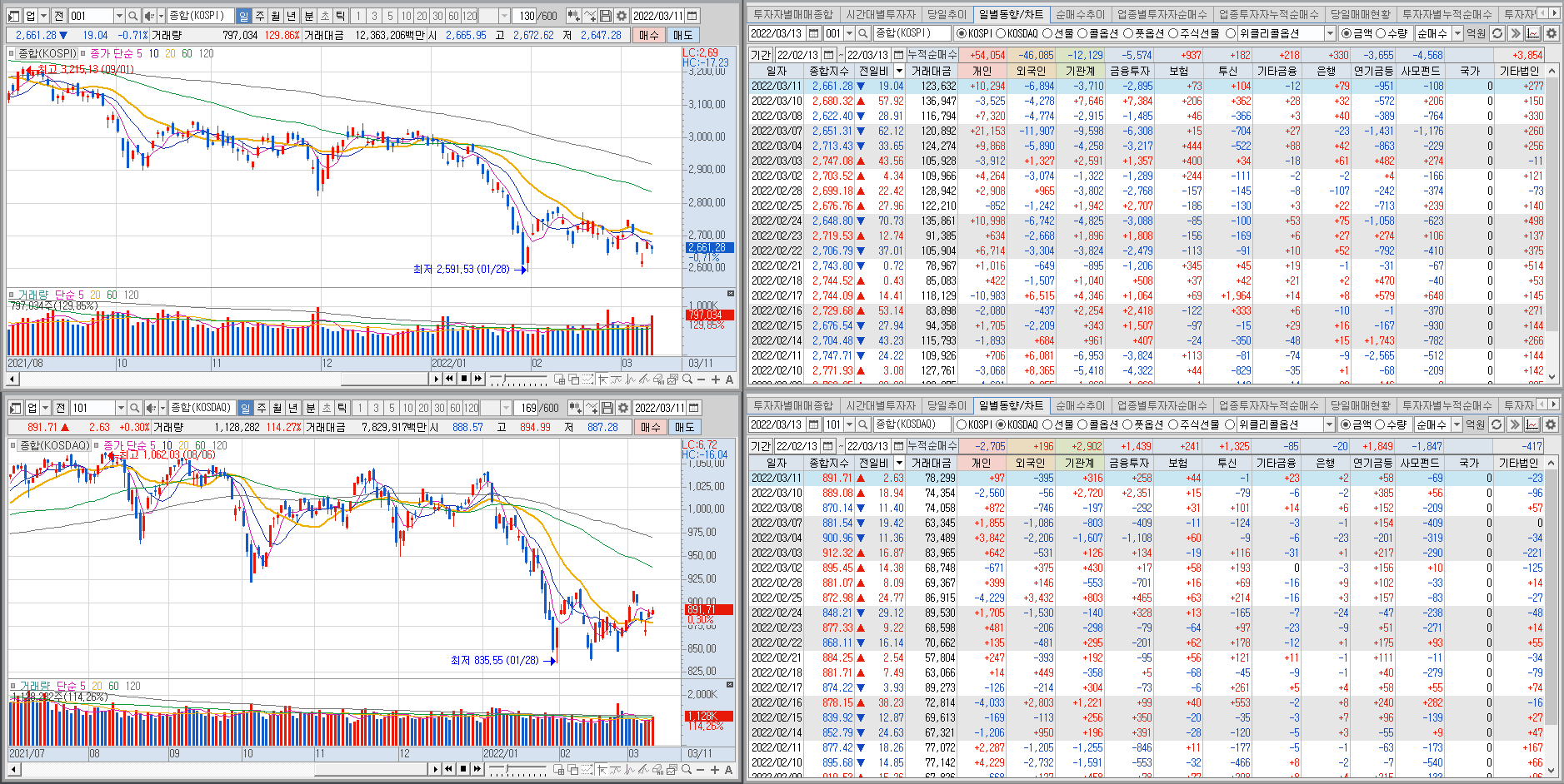 하락 압박을 가하고 있음. 외인 기관이 들어와줘야 상승으로 돌아설듯